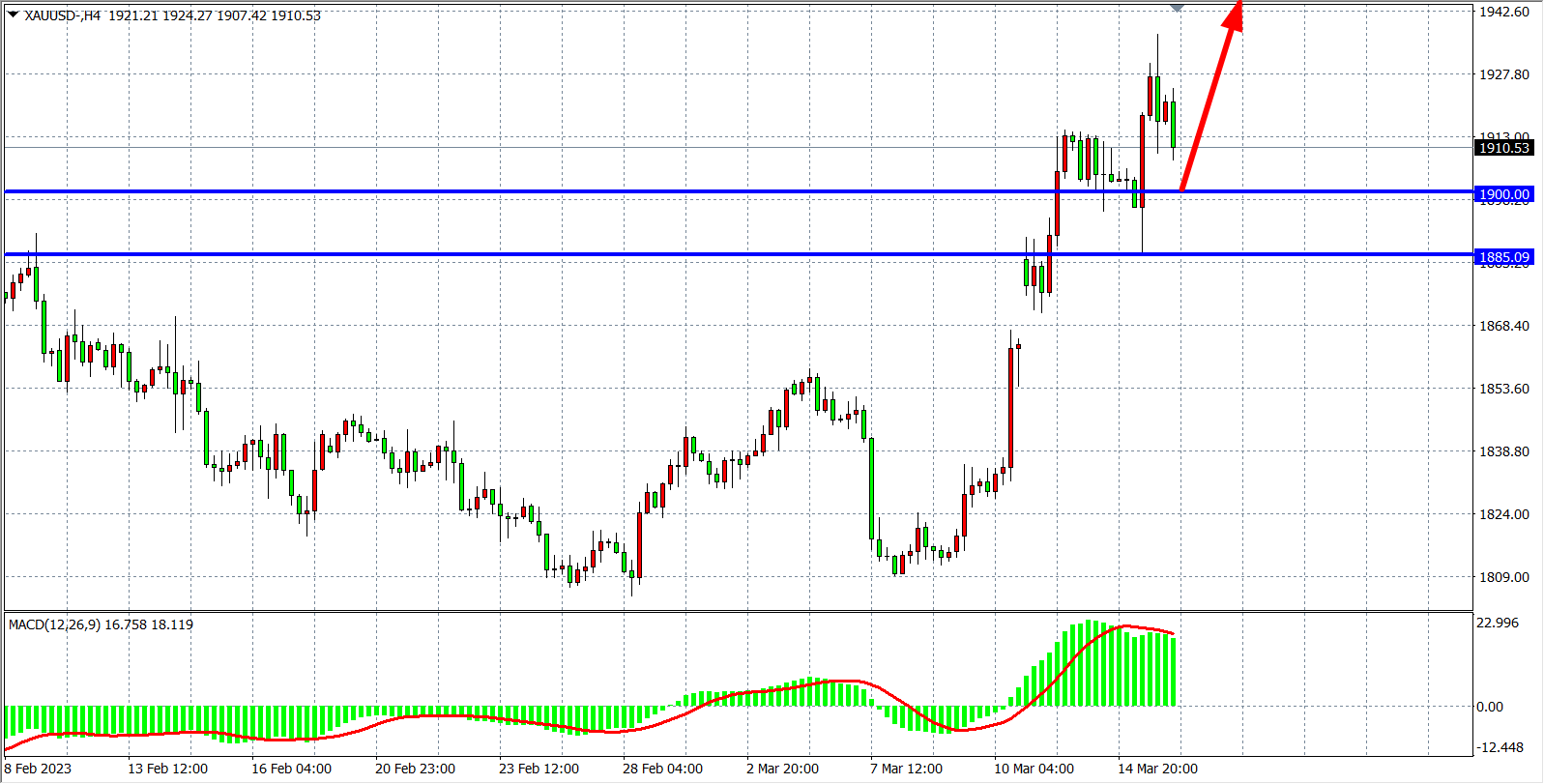 4小时图看,现货黄金进一步走高上破1910关口,最高触及1937附近随后回落,MACD在零轴上出现二次放量,多头趋势依旧占住主导,日内以1900为多空分水岭,在该位之上继续看涨,上方目标1920-1940附近。