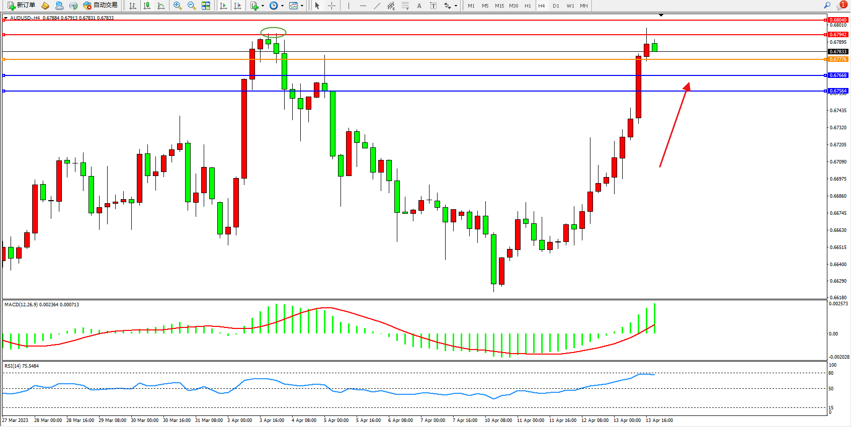 澳元美元AUDUSD——4小时K线图显示: