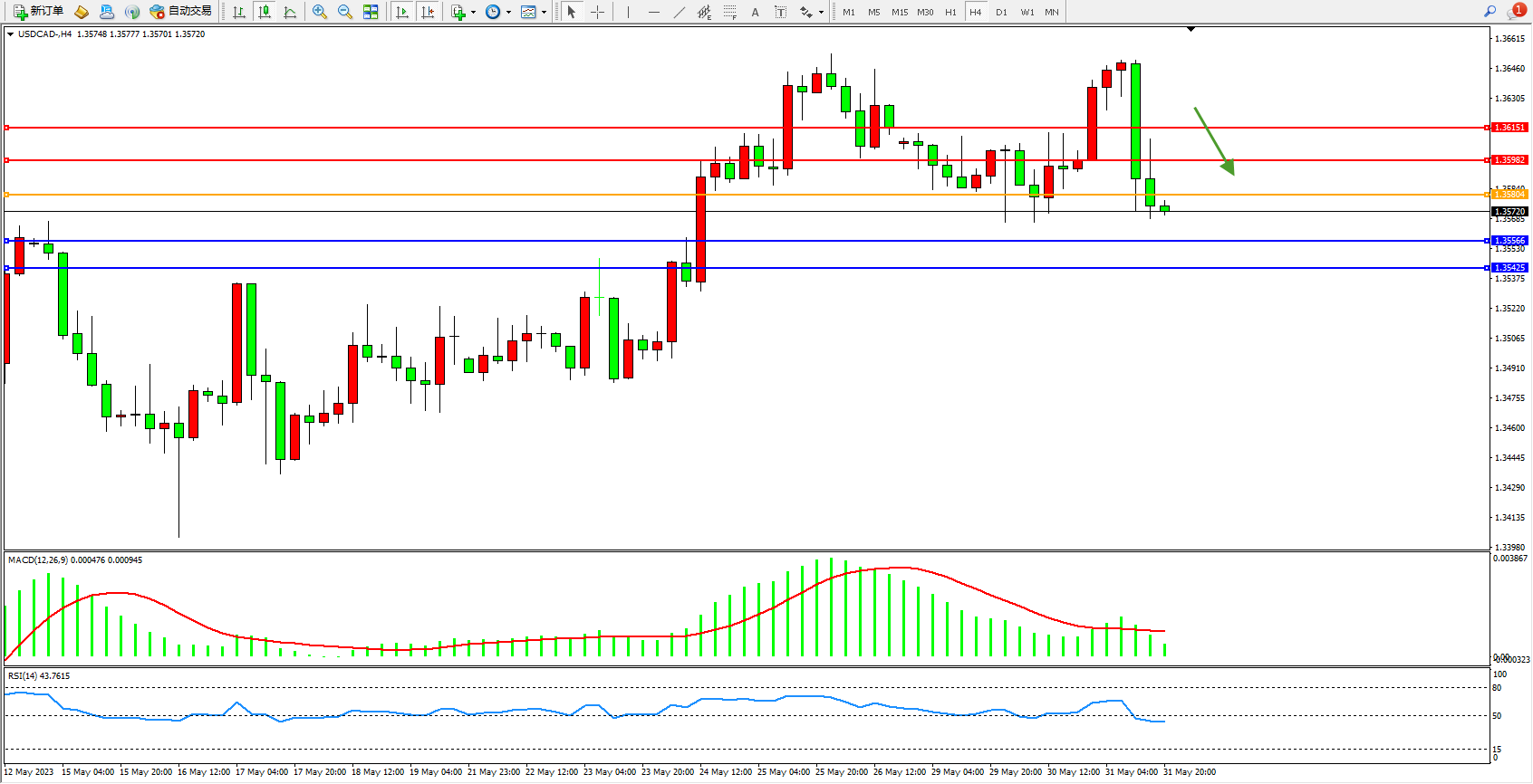 美元加元USDCAD——4小时K线图显示: