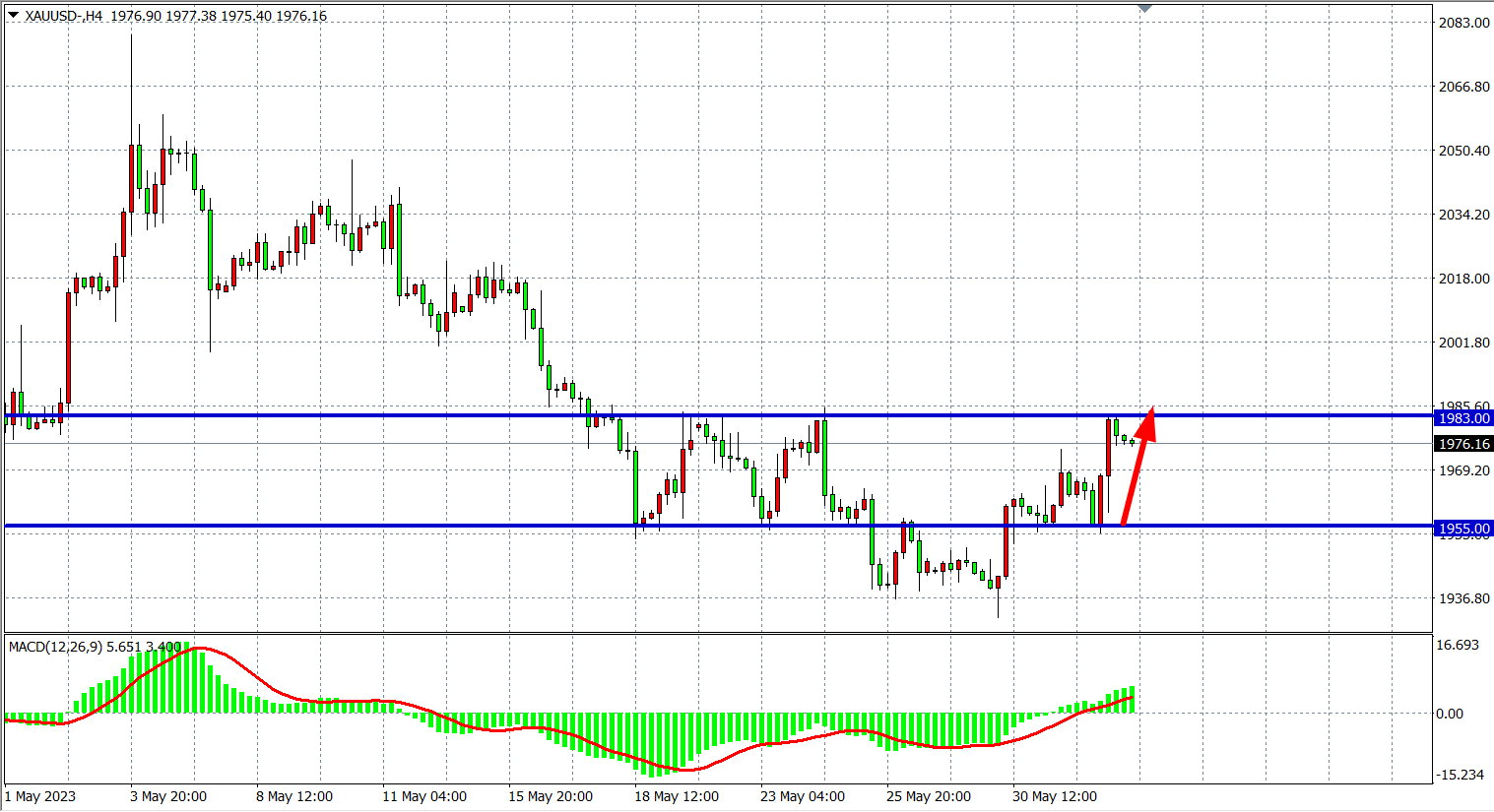 4小时图看,黄金在1955之上进一步反攻,最高涨至1983附近,当前支撑继续关注1955,MACD量能在零轴之上整齐放量,在1955之上看涨,上破1983则看至2000附近。