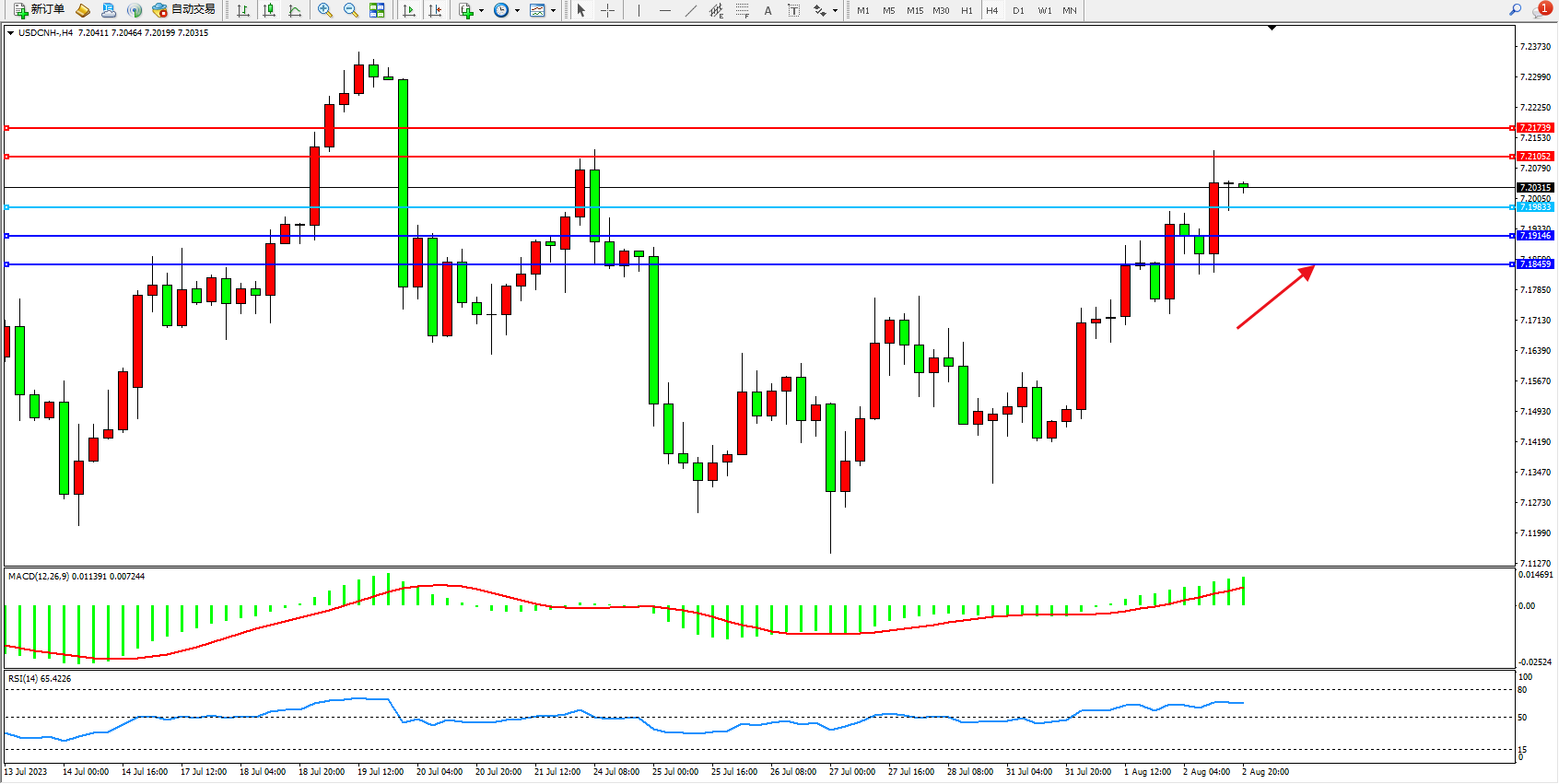 美元人民币USDCNH——4小时K线图显示: