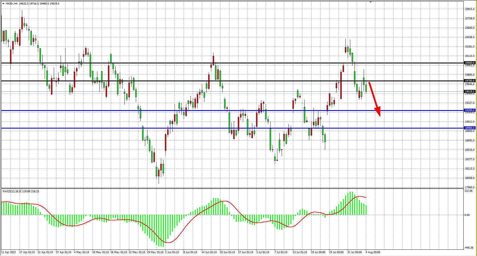 交易策略:19700    下方看跌,目标 19200  18900