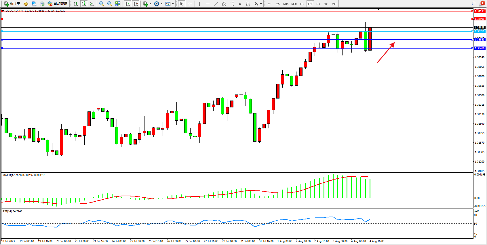 美元加元USDCAD——4小时K线图显示: