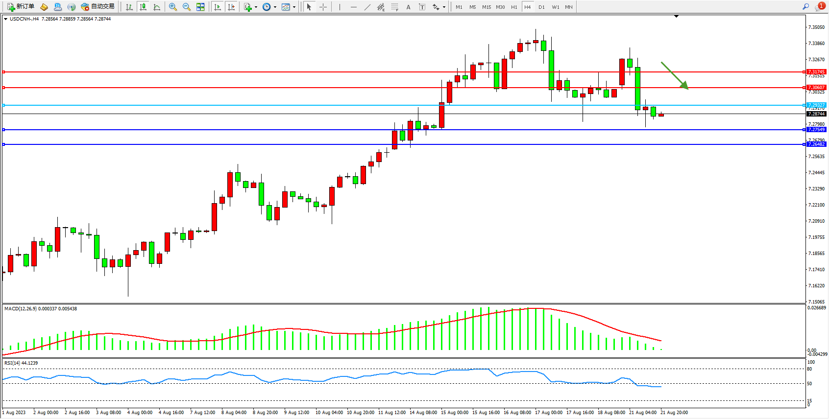 交易策略:7.29327下方看跌,目标7.27549 7.26482
