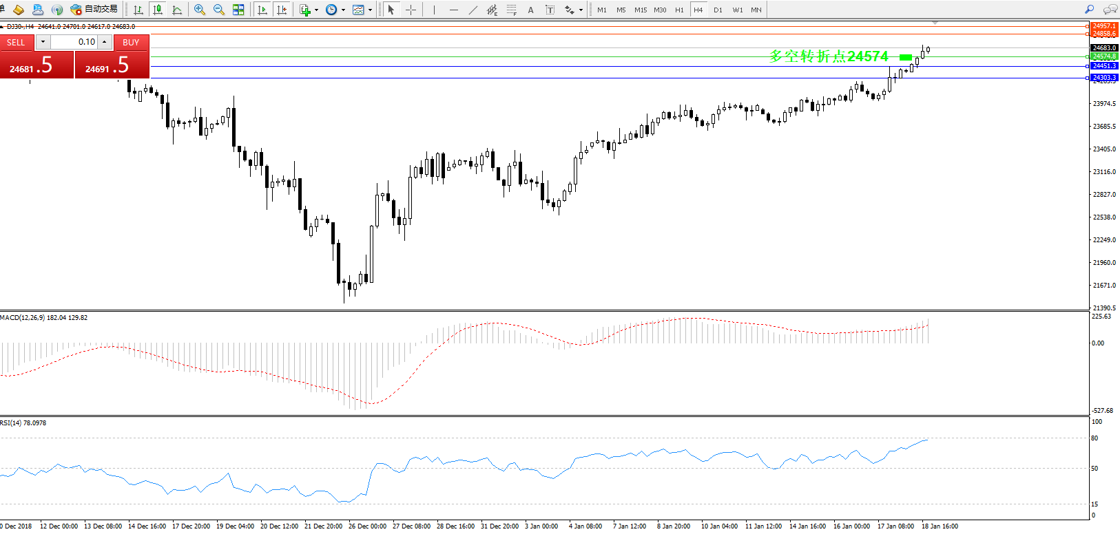 道琼斯指数DJ30—— 4小时K线图显示: