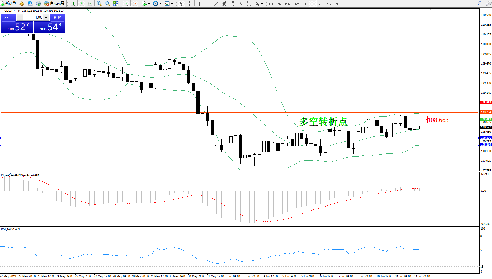 备选策略:108.663上方看涨,目标108.794、108.968