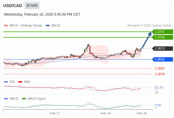 美元/加元 当日内 : 看涨,当 1.3632 为支撑位。