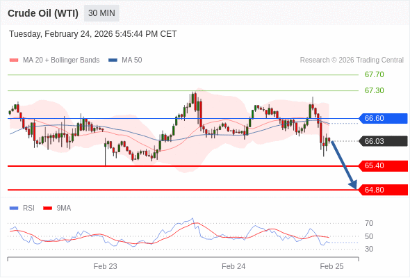 在 66.60 之下,看跌,目标价位为 65.40 ,然后为 64.80 。