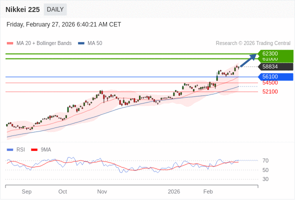 在 56100 之上,看涨,目标价位为 61000 ,然后为 62300 。