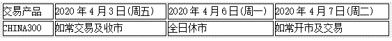 因应中国大陆202044(周六)至4月6日(周一)清明节假期,沪深300指数CHINA300的将于4月6日(周一)全日休市,敬请阁下留意知悉!