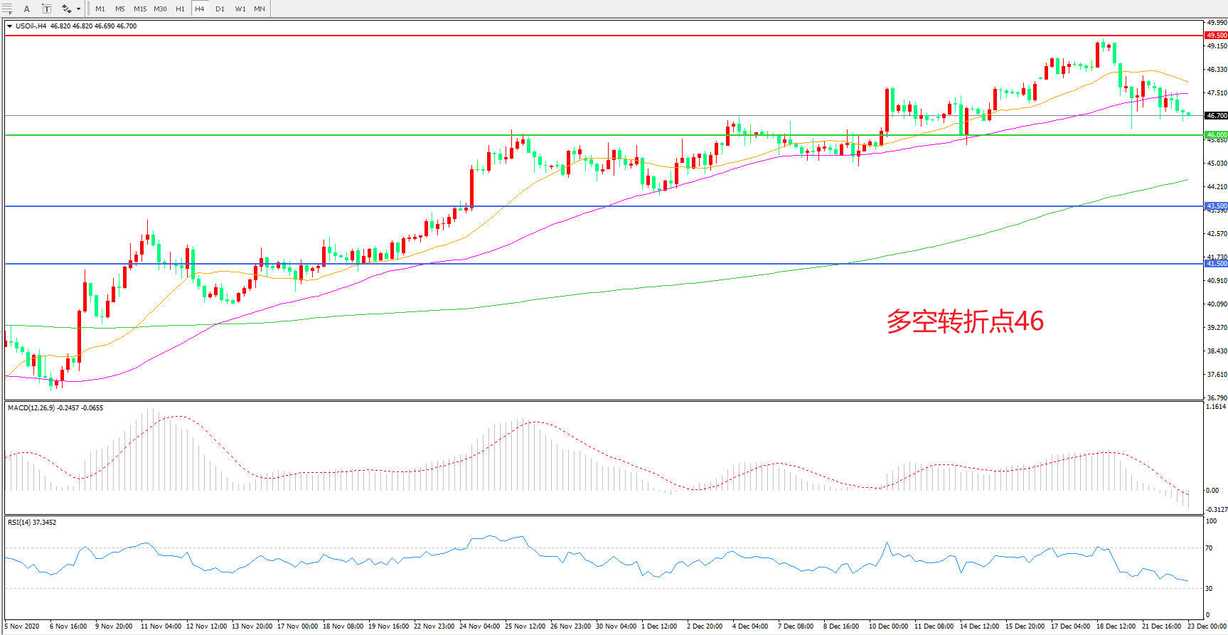 交易策略:在46.00之下看跌,目标43.50          41.50