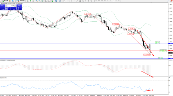 空头动力延续布林带指标通道中下轨区间持续震荡下行,低位抵达1.22755附近节点后开始震荡,短期空头下行态势良好,且未见有止步迹象,布林带指标呈张口走势后开始缓慢张口下行,上方压制关注1.26459附近,低位支撑关注1.21442附近,关注1.24091附近转折点,MACD指标处于空头区域低位维持弱势不断下移,RSI指标处于空头区域地位弱势整理有上移迹象,如图: