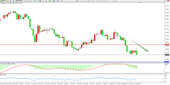 市场空头情绪笼罩,短期跌势未见止步,前期低位已然破位,且有继续向下移动态势,上方压制关注1.19502附近,低位支撑关注1.15929附近节点,MACD指标处于空头区域维持弱势下行,RSI指标处于50均衡线下侧窄幅整理,如图: