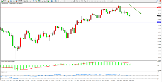 高位空头动力维持震荡下移,短期跌势或将延续,市场整体开始缓慢下移,上方压制关注1.23716附近,低位支撑关注1.17887附近,MACD指标处于0轴线上侧弱势下移,RSI指标处于50均衡线下侧弱势整理;