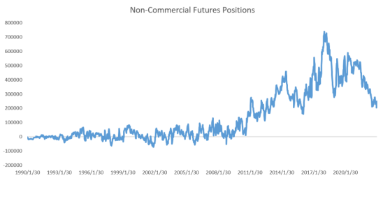 这里的逻辑是:原油产量缺口--->能源股预期上涨--->生产商股价好就愿意多产原油--->近端石油消费需求跟不上--->原油轻度过剩带来油价回调--->需求彻底回归--->生产商挺价--->油价上涨。但是由于今年美国原油期货的持仓量数据持续下降,大基金经理做多原油,很多由于流动性受限,所以周五的GSGI指数在开盘下跌后就走平,可以视为大基金已经悄悄开始买入,出现了支撑。