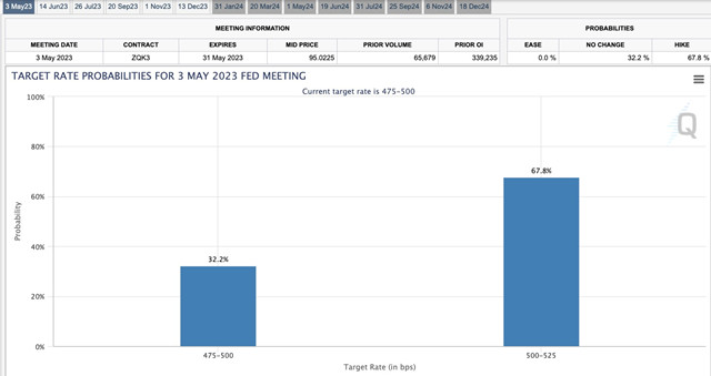 经济形势不明朗叠加地区银行流动性危机,市场和美联储内部对未来加息步调的分歧加大。截至第一财经记者发稿,据芝商所利率观察工具(FedWatch Tool),按兵不动的概率为32.2%,加息25个基点至5.0%~5.25%的概率为67.8%。
