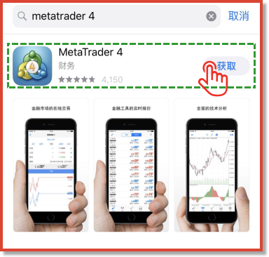 在APP Store,搜索 MetaTrader4,点击“获取”安装即可完成。如下图所示: